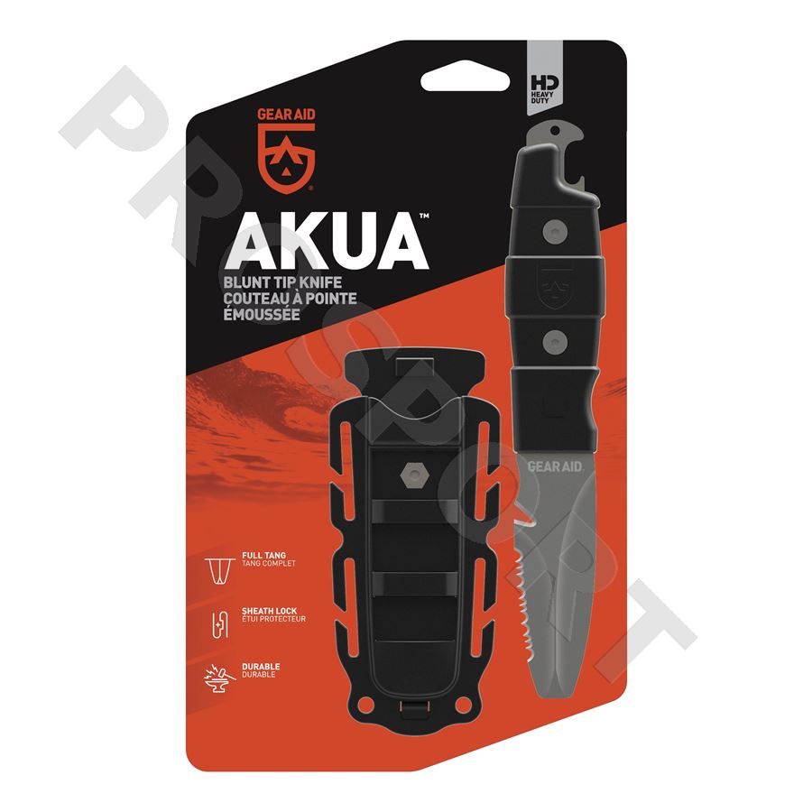 Nôž AQUA má pevnú čepeľ z nehrdzavejúcej ocele 420 a puzdro, ktoré sa ľahko pripevní k vášmu vybaveniu a umožňuje rýchle vybratie. Rovnako ako všetky nože GEAR AID je vyrobený z jedného kusu nehrdzavejúcej ocele. Čepeľ je prinitovaná k časti tvoriacej rukoväť a je vyrobená z odolného plastu. Je vhodný na rybolov a sladkovodné vodné športy. Titánom potiahnutá 7,6 cm dlhá čepeľ s plochým koncom má rovné aj pílovité ostrie a zárez na jednoduché rezanie vlascov a šnúr. Na konci za rukoväťou je otvárač na fľaše a očko na pripevnenie slučky alebo šnúrky. Rýchloupínacie puzdro s odnímateľnou sponou na opasok sa ľahko pripevní na batohy, opasky, topánky a PFD systémy upínania MOLLE.